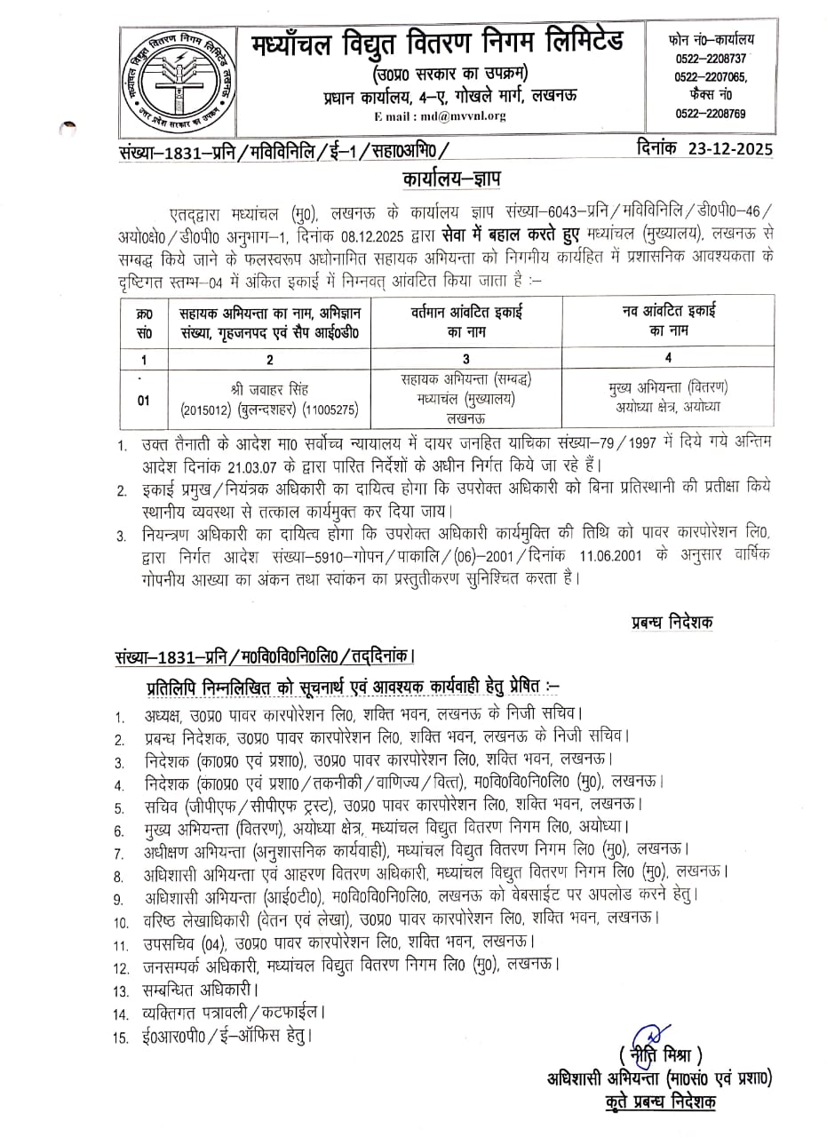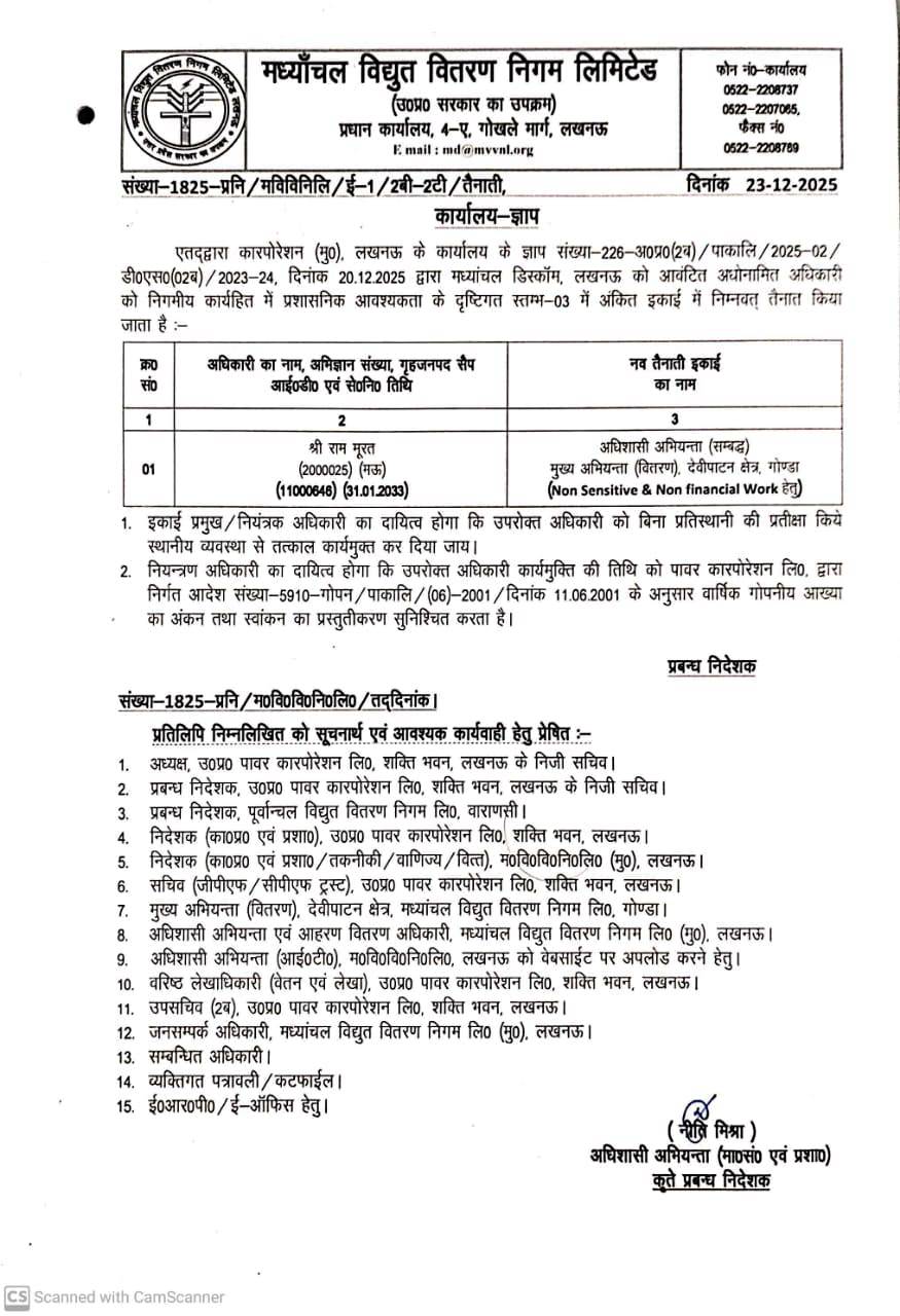 अधिशासी अभियंता (श्री राम मूरत) के तैनाती के संबंध में