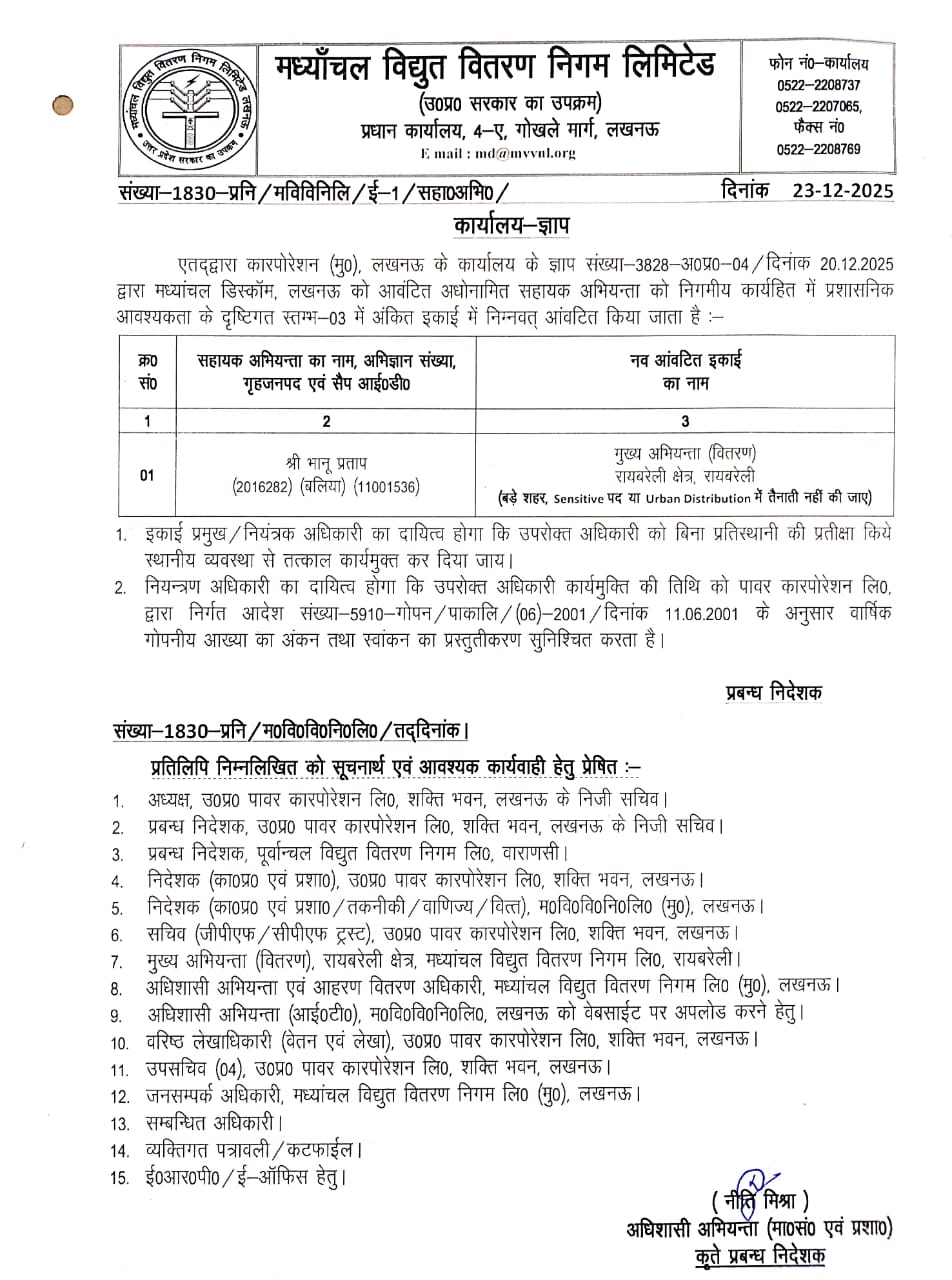 सहायक अभियंता (श्री भानु प्रताप) के तैनाती के संबंध में