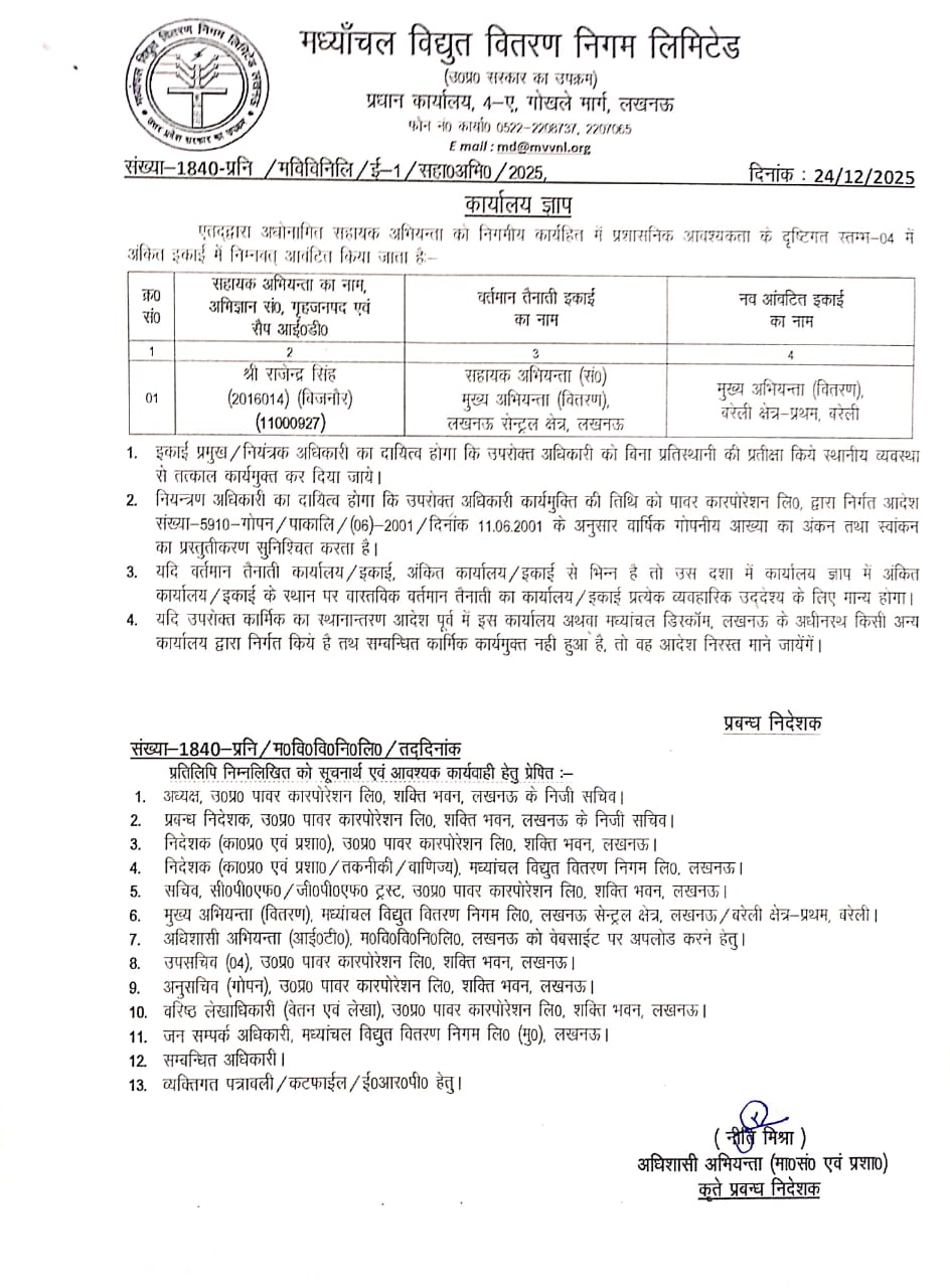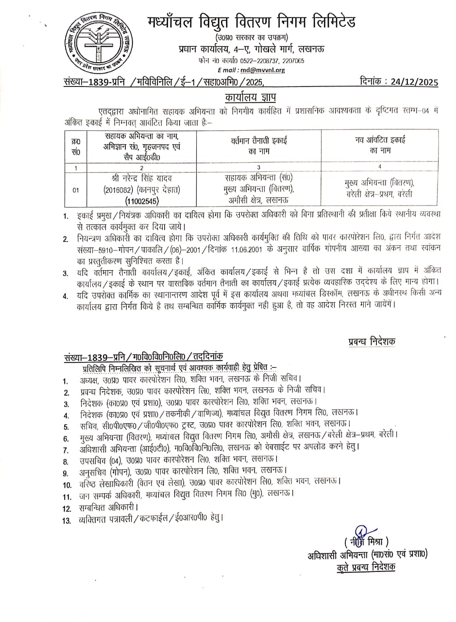 अधिशासी अभियंता (श्री राम नरेश) के तैनाती के संबंध में