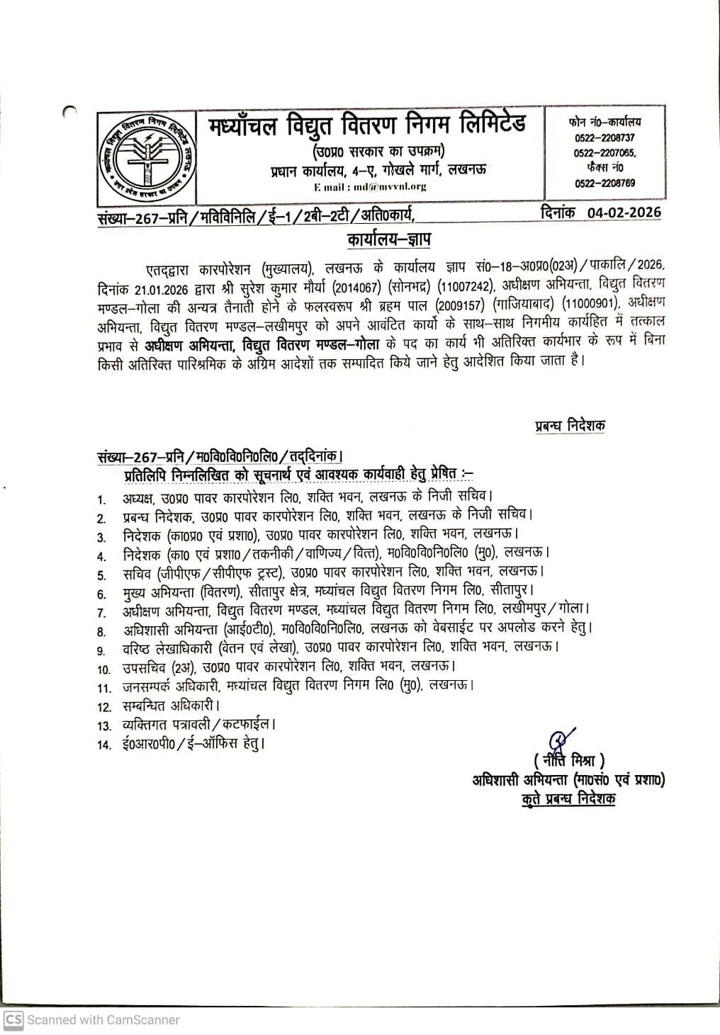 Regarding Work Allotment of EE (Shri Shailendra Kumar)