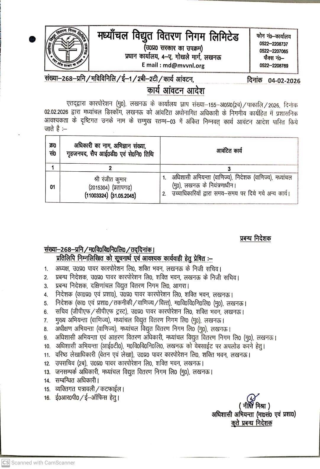 Regarding Work Allotment of EE (Shri Ranjeet Kumar)