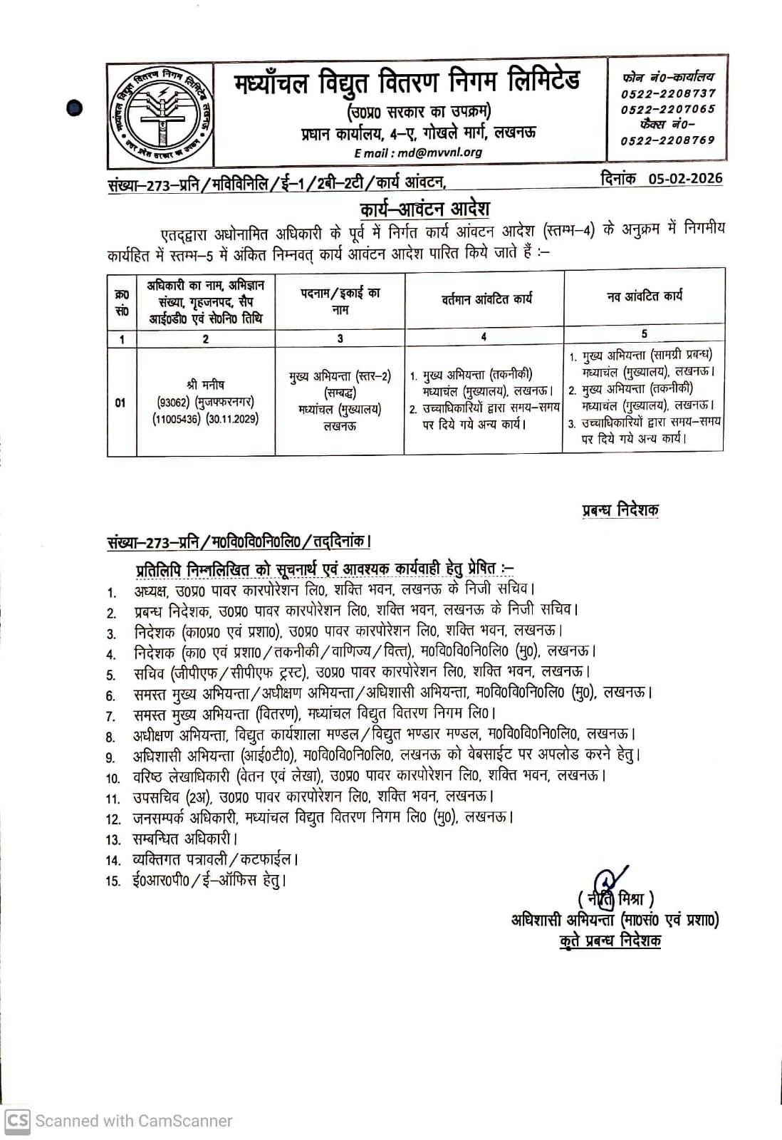 Regarding Work Allotment of CE (Shri Manish)