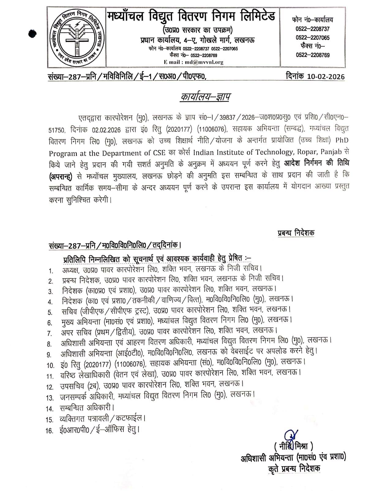 Regarding permission to AE (Smt. Ritu) to pursue higher education under Higher Education Scheme