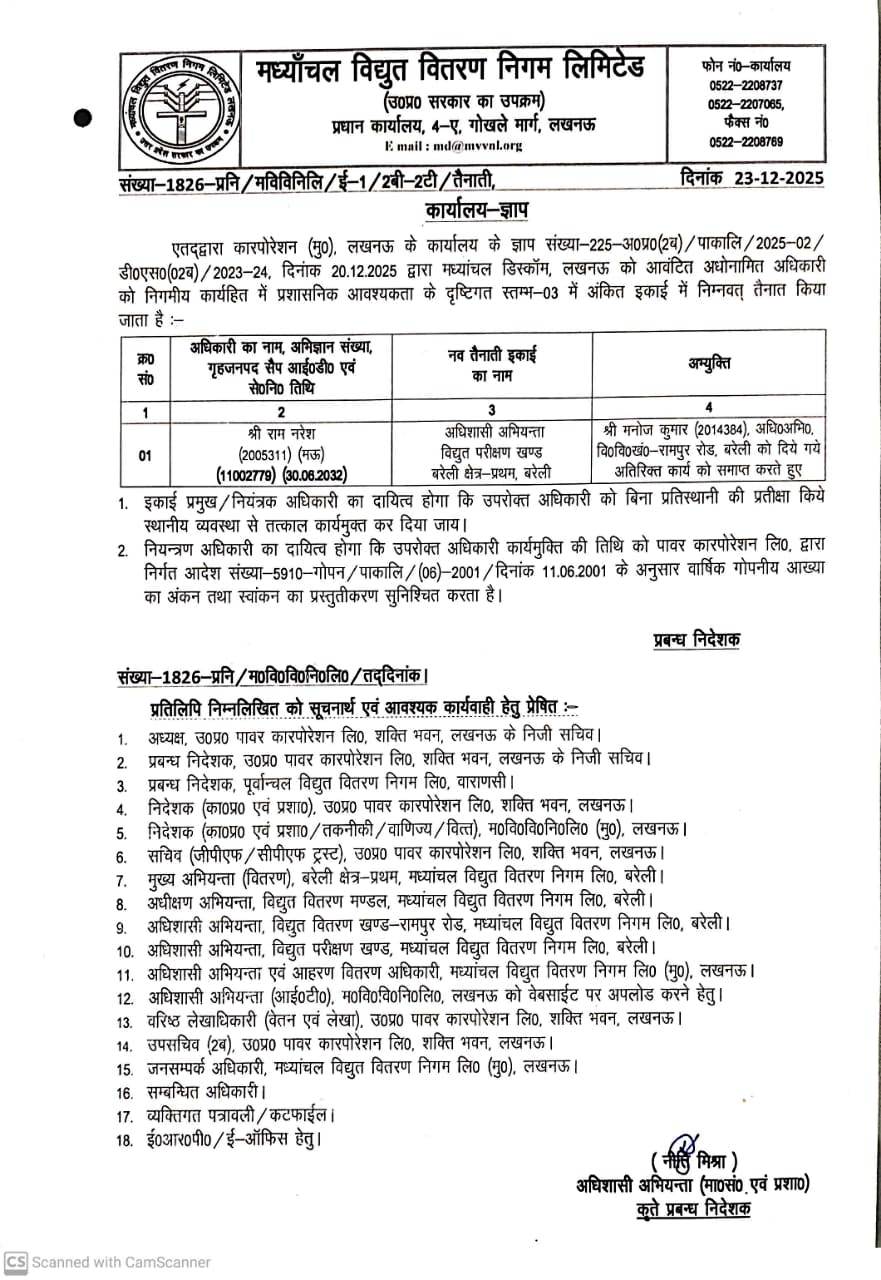 Posting/ Transfer of EE (Shri Ram Naresh)