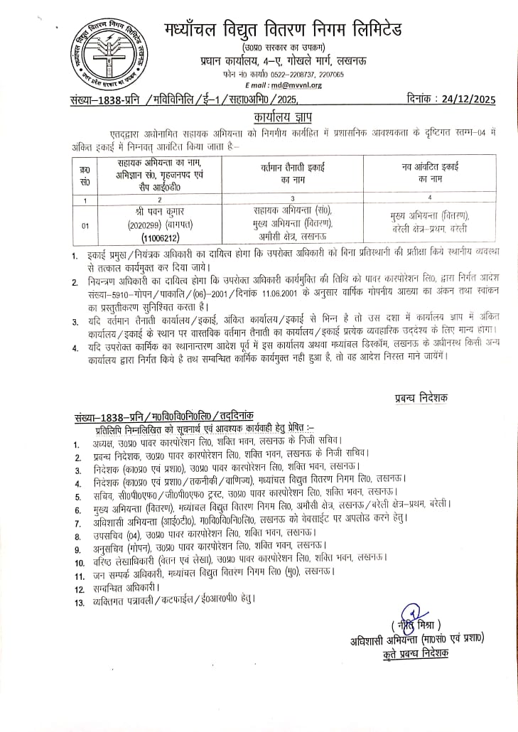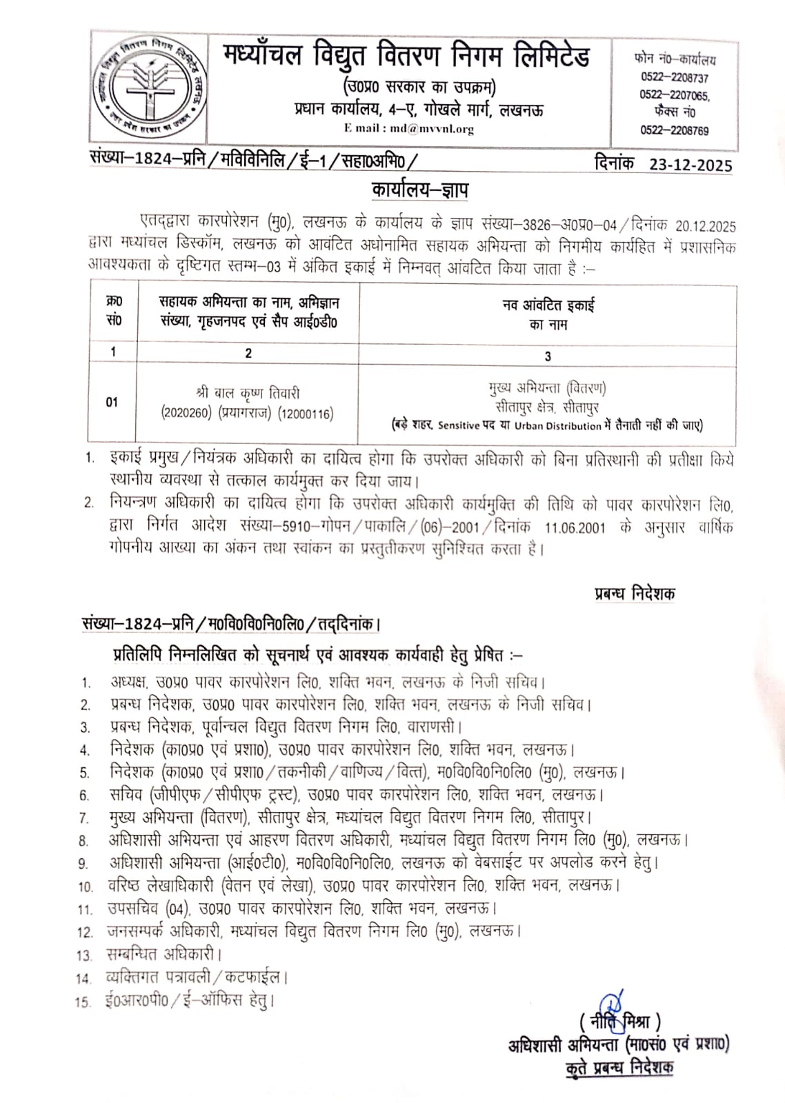 Posting/ Transfer of AE (Shri Bal Krishna tiwari)