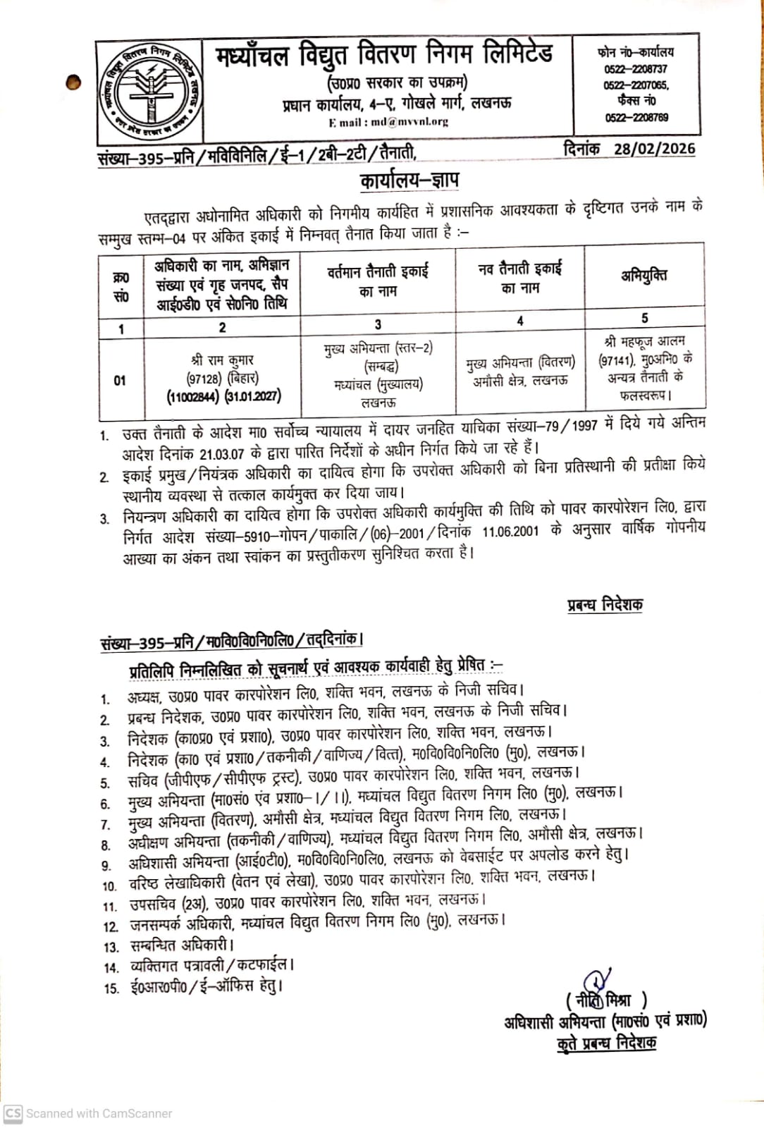 Regarding Posting of AE (Shri Akhilesh Kumar Yadav)