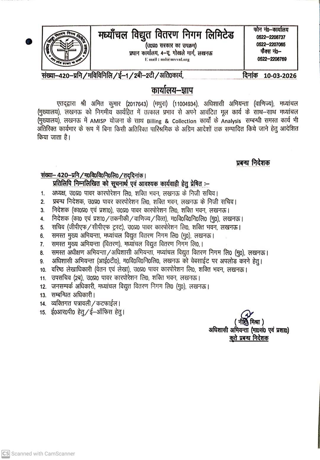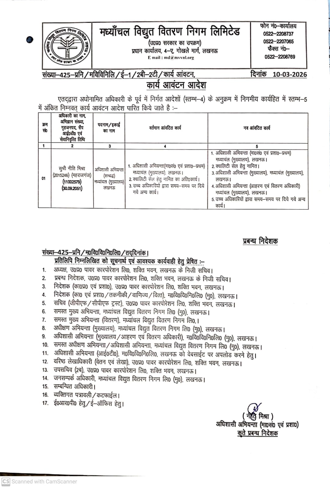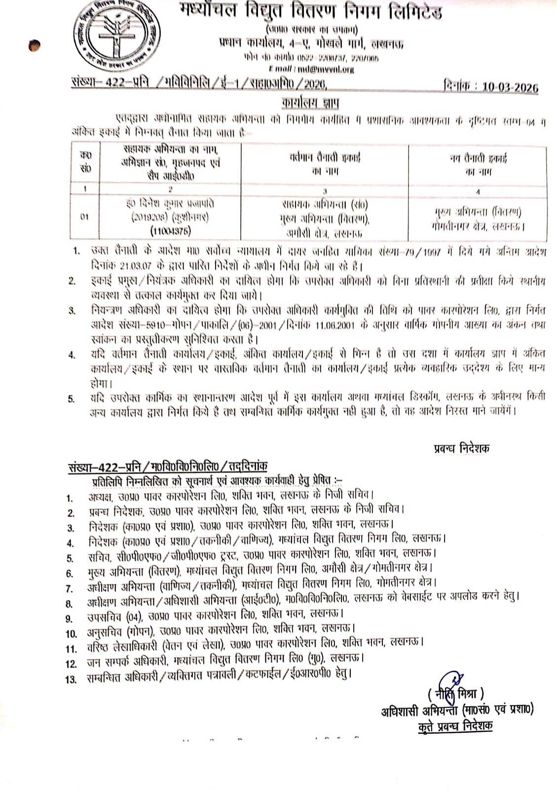 Regarding Work Allotment of EE (Ms Neeti Mishra)
